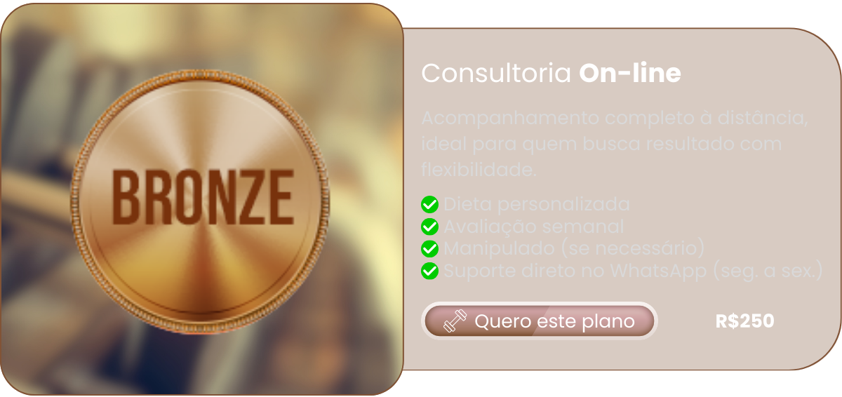 Dieta não pode ser punição. Ela precisa ser sustentável. Na consultoria, montamos plano alimentar ajustado à sua realidade, com alimentos acessíveis e estratégia inteligente de flexibilidade. O segredo não é sofrer é manter consistência.